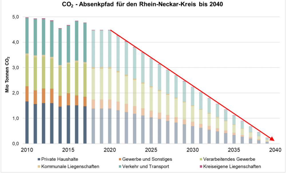 Der Rhein-Neckar-Kreis plant die Reduktion der Treibhausgasemissionen auf null bis 2040. So steht es in der neuesten Version des Klimaschutzkonzeptes, dessen ursprüngliche Version aus dem Jahr 2013 stammt. Einstimmig wurde nun auf der Sitzung des Rhein-Neckar-Kreistags in Sinsheim am 15. Dezember 2020 die Offenlegung des Entwurfs zum neuen Klimaschutzkonzept beschlossen. In diesem Konzept setzt sich der Kreis zumindest implizit das Ziel, die gesamten Treibhausgasemissionen im Rhein-Neckar-Kreis bis 2040 auf null herunterzufahren. Leider ist diese Aussage nur indirekt in einer Grafik enthalten. Dazu, wie, in welchen Schritten und wo im Kreis die dazu nötige Nutzung der Erneuerbaren Energien ausgebaut werden kann, soll nun rasch eine detaillierte Studie erstellt werden. Parallel dazu ist nun die Öffentlichkeit eingeladen, ihre eigenen Vorschläge einzubringen, wie sie sich einen Klimaschutz hier vor Ort wünscht.