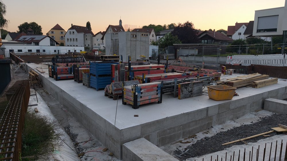 Seit dem Spatenstich im Mai ist einiges passiert, und die Fortschritte sind nicht zu übersehen. Nachdem der Keller für die Energieversorgung erstellt worden war, wurden die Fundamente für den Rest des Gebäudes errichtet und die Betonbauer begannen, die Bodenplatte zu gießen. In einer Gemeinderatssitzung im Juli und in regelmäßigen Jour Fixes tauscht sich das Architekturbüro rohwareimstudio mit der Gemeinde über den Baufortschritt aus. Aktuell ragen zwei Betontürme in die Höhe – das eine ist der Aufzugschacht und das andere aufragende Rechteck wird die Technik beinhalten. Schließlich muss auch Strom und Wasser ins Obergeschoss gelangen. Wenn weiter alles nach Plan läuft, wird die Außenhülle des Gebäudes noch in diesem Jahr errichtet werden, sodass im nächsten Jahr mit dem Innenausbau begonnen werden kann.