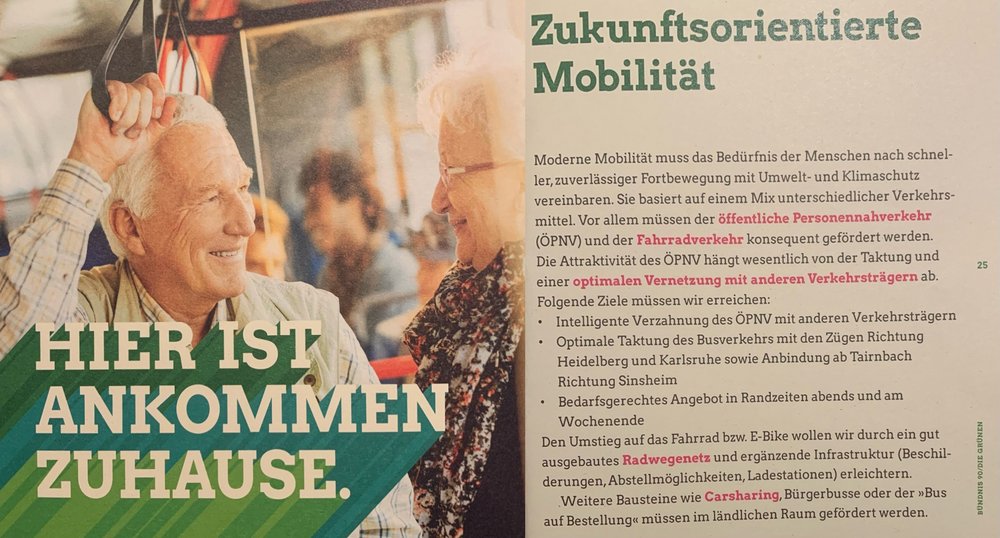Für den öffentlichen Nahverkehr wurde Anfang dieses Jahres das 1 EURO Ticket für den innerörtlichen Busverkehr eingeführt. In einigen Nachbargemeinden (Malsch, Walldorf) gibt es sogar ein kostenloses Angebot. Allerdings haben diese Angebote doch einige Nachteile. Will ich von Mühlhausen nach Malsch fahren, kann ich mir nun überlegen, ob ich für 1 EUR bis Malscher Straße in Rettigheim fahre, dann nach Malsch laufe, um dann in den kostenlosen nächsten Bus einzusteigen. Oder ob ich halt den Ticketpreis komplett zahle. Mal schauen, wie das Angebot angenommen wird. Bzgl. bedarfsgerechter Angebote zu Randzeiten und am Wochenende besteht immer noch Nachholbedarf, gerade sonntags. Hier sollten eventuell die Ruftaximöglichkeiten wieder stärker beworben werden. Denn wirklich bekannt sind diese nicht, da sie auch an den Haltestellen nicht aufgeführt sind. Auch fehlt eine Ruftaxilinie zum Bahnhof Rot-Malsch.